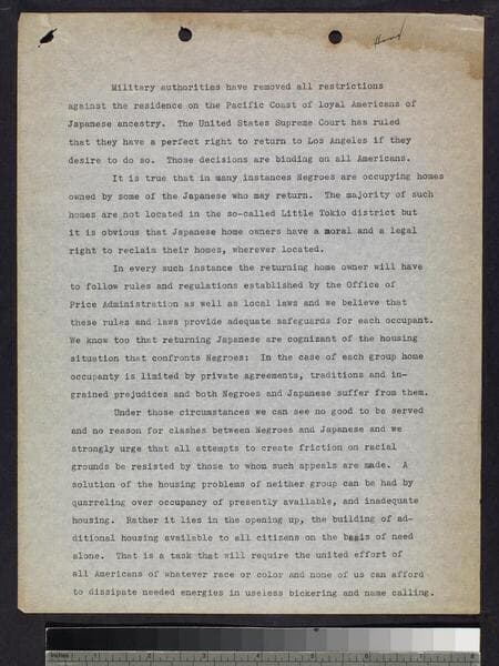 Untitled speech by Loren Miller re: Japanese Americans returning to Los Angeles