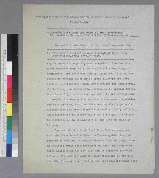 The papers of Edwin P. Hubble include manuscripts and reprints of his articles, papers, public lectures, addresses, etc., scientific documentation for his papers, logbooks of photographic plates taken by Hubble at Mount Wilson and Palomar Observatories, diaries and biographical memoirs of his wife Grace Burke Hubble, professional, personal, and social correspondence, photographs, medals and awards, a scrapbook assembled by Grace Hubble, newspaper clippings, etc.