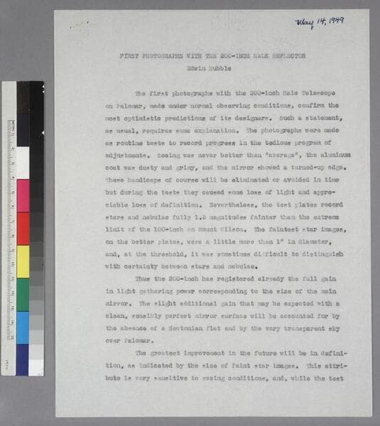 Edwin [Powell] Hubble. First Photographs with the 200-inch Hale Reflector. Published under the title, ?First Photographs with the 200-inch Hale Telescope,? in Publications of the Astronomical Society of the Pacific 61 121-124