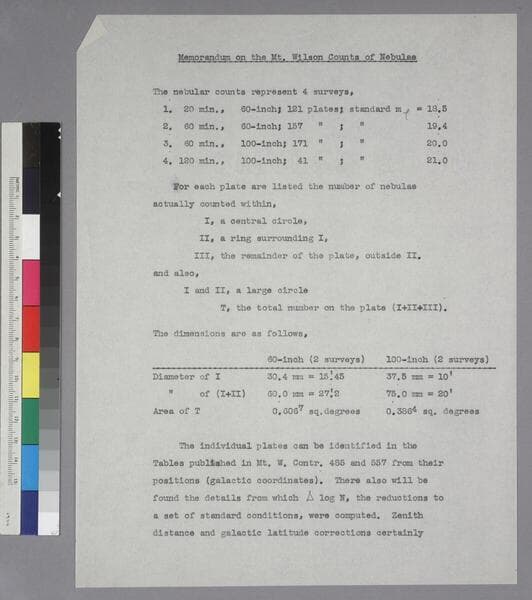 The papers of Edwin P. Hubble include manuscripts and reprints of his articles, papers, public lectures, addresses, etc., scientific documentation for his papers, logbooks of photographic plates taken by Hubble at Mount Wilson and Palomar Observatories, diaries and biographical memoirs of his wife Grace Burke Hubble, professional, personal, and social correspondence, photographs, medals and awards, a scrapbook assembled by Grace Hubble, newspaper clippings, etc.
