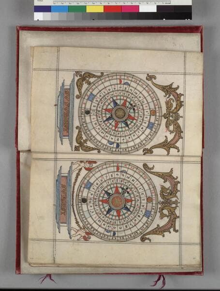 World atlas containing 10 nautical charts, table of declinations, etc.: 1. f. 1v: Circular calendar 2. f. 2v: Table of declinations 3. f. 3: Armillary sphere 4. ff. 3v-4: Zodiac with small Atlantic hemisphere in center with a central cord to be used as a pointer 5. ff. 4v-5: Pacific Ocean with portions of North America, South America, Asia, and East Indies 6. ff. 5v-6: Atlantic Ocean with portions of North America, South America, Europe, and Africa 7. ff. 6v-7: Indian Ocean, Africa, southern Asia, and portion of East Indies 8. ff. 7v-8: British Isles, France, and northern Spain 9. ff. 8v-9: Iberian peninsula and northwest Africa 10. ff. 9v-10: Western Mediterranean and Italy 11. ff. 10v-11: Eastern Mediterranean, Italy, and Aegean Sea 12. ff. 11v-12: Black Sea 13. ff. 12v-13: Aegean Sea 14. ff. 13v-14: Oval map of the world (showing one route: around the world via the Moluccas) 15. f. 14v: Ruling for calendar.