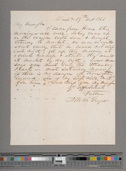 The McGregor family correspondence primarily consists of letters from Nathaniel Mortimer McGregor to his son, Roderick Mortimer McGregor, who was attending Maryland Agricultural College. McGregor also received letters from other family members including his mother Susan Euphemia Mitchell McGregor and his siblings. The bulk of these letters were written between 1860 and 1862. The correspondence suggested a tepid loyalty to the Union and a deep worry over the end of their plantation lifestyle. The family's slaves were a frequent topic of concern. In a letter dated 1861 March 9, McGregor's father reported a family slave who escaped, "George had no good clothes to go off in to Washington...I had to give him 75 lashes in about 2 hours before he let out the truth." The family also discussed the secession movement in Maryland, Peace Conference of 1861, family affairs, local and national politics. Also included are two cartes-visites of Roderick, along with his election certificate and report cards, Nathaniel's will, printed booklets, a recipe for curing meat, and three genealogical notes written after 1901. There is one newspaper clipping about Eleanor Wood at Whetsone Convalescent Center in the Columbus Dispatch printed on 1984 July 22.