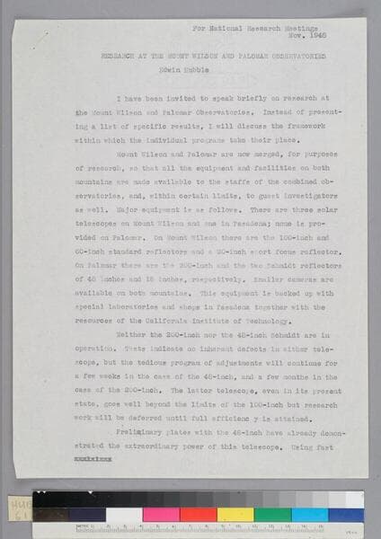 The papers of Edwin P. Hubble include manuscripts and reprints of his articles, papers, public lectures, addresses, etc., scientific documentation for his papers, logbooks of photographic plates taken by Hubble at Mount Wilson and Palomar Observatories, diaries and biographical memoirs of his wife Grace Burke Hubble, professional, personal, and social correspondence, photographs, medals and awards, a scrapbook assembled by Grace Hubble, newspaper clippings, etc.