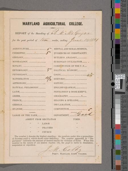 Maryland Agricultural College report of the standing of R.M. McGregor, 1861