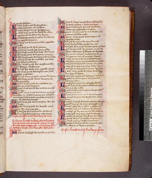 ff. 1-152v. [Gautier de Metz] [Image du Monde]. Incipit: //Qu'ainsi dampnent euls et autrui/ Ce qui puet l'omme a mal conduire. Explicit: Et il en a loisir et temps/ Car dieu lui rendra si hault don//. French. Second recension (with the Brendan interpolation on ff. 23-54v) according to the classification discussed by P. Meyer, "L'Image du Monde," Romania 21 (1892) 481-505. The Brendan interpolation printed by A. Jubinal, La Legénde latine de saint Brandaines (Paris 1836) 105-64. For a list of 72 manuscripts of the Image du Monde, not including EL 26 A 3, see E.-D. Grand in École nationale des Chartes, Positions des thèses (Paris 1885) 81-84. Status of text: Beginning and ending defectively. ff. 153-186v; ff. 187-188v, blank. [Jean de Meun] [Testament]. Incipit: Li peres, li fils et li Sains Esperis/ Uns dieux en troix personnes honores et cheris. Explicit: Et li prit humblement que nous soions escript/ Ou Saint livre de vie que il meismes escript. Amen. Explicit le testament maistre Iehan de meun qui fus nes sus loyre a meun. Et servi toute sa vie de bon ["coeur" indicated by a sketch of a heart] la vierge marie. Escript l'an mil iiii cens et x le iours de la Saint denis. Rubric: Le testament maistre Iehan de meun dit clopinel. French. D. M. Méon, ed., Le Roman de la Rose par Guillaume de Lorris et Jehan de Meung (Paris 1814) 4:1-116; G. Piffard, "Le Testament de Jehan de Meun d'après le manuscrit HM [incorrect citation] EL 26 A 3, Henry E. Huntington Library, San Marino, California," unpublished thesis, Strasbourg, 1965. For a list of 116 manuscripts, including EL 26 A 3, see S. Buzzetti Gallarati, "Nota bibliografica sulla tradizione manoscritta del Testament di Jean de Meun," Revue Romane 13 (1978) 2-35, citing this manuscript on pp. 5, 30. ff. 189-209v. [Descente de Saint Paul en Enfer, version of Geoffroi de Paris]. Incipit: Ore escoutes seigneurs/ Qui damledieu ames/ Qui les paines d'enfer/ Et les douleurs cremes/. Explicit: La nous doinst parvenir/ Ou li bons seront lie/ Em pardurable gloire/ En son haultisme sie. Amen. Explicit romanum Sancti pauli apostoli Anno domini millesimo quadrigentesimo quinto decimo. In festo sancti Marci evvangeliste. Rubric: Incipit Romanum Sancti pauli apostoli. French. Other creator(s): Geoffroi de Paris, version of. Similar to the version of the text printed by L. E. Kastner, "Les versions françaises inédites de la Descente de Saint Paul en enfer," Revue des Langues Romanes 49 (1906) 427-49, as the "version de Geoffroi de Paris," from Paris, B.N. fr. 1526 (a somewhat faulty copy); see also W. Meiden, unpublished doctoral edition, Ohio State University, 1945. The Huntington manuscript begins on line 9 of the printed text, and generally corresponds up to line 586; the printed text then has 3 more lines, while EL 26 A 3 continues for an additional 54 lines. ff. 209v-210. [Visio sancti Pauli]. Incipit: Item inveni in alio loco quomodo Sanctus michael archangelus duxit sanctum paulum ad omnia loca inferni. Et libellus Incipit sic. Dies dominicus dies est electus in quo gaudebunt angeli et archangeli maior diebus ceteris et cetera. Et quomodo sanctus michael prostravit se et paulus et milia milium angelorum ante filium dei ut Requiem haberent die dominico. Explicit: non possent dinumerare penas inferni. Nos ergo fratres karissimi audientes ista mala convertamur ad dominum ut cum ipso Regnemus et vivemus. In secula seculorum. Amen. Finis est libri ubi hec omnia inveni. Amen. Latin. T. Silverstein, Visio Sancti Pauli. Studies and Documents 4 (London 1935); this manuscript corresponds generally to the text on p. 202 (end of Redaction V). ff. 210v-212; f. 212v, blank. [Devotions to St. John the Baptist]. Latin. Hymn, versicle, response and prayer to John the Baptist. ff. 213-278v. [Jacobus de Cessolis]. Ludus scaccorum. Incipit: Entre tous les mauves signes qui puent estre en nul homme C'est quant homme ne doubte a couroucier par pecchie. Explicit: Car Ioie est une replection de chose qui est delittable espandue parmi tous les membres a tres grant leesce et dons si tendent a tres grant Ioie avoir. Mais ils ne scevent mie qu'il//. Rubric: Ci commence le livre de la moralite de nobles hommes fait sur le Gieu des esches et soubs quel Roy ils furent trouves premierement. French. Other creator(s): Jean de Vignay, translator. Text opens with a prologue ("A Tres noble et Excellent prinpce Iehan de france duc de Normandie et Ainsne fils de philippe pour la grace de dieu Roy de france frere Iehan de Vignay") and a chapter list. C. S. Fuller, "A Critical Edition of Le Jeu des eschés, moralisé, Translated by Jehan de Vignay," unpublished doctoral dissertation, Catholic University of America, 1974, based on 48 manuscripts, including EL 26 A 3 (ends defectively). Kaeppeli, SOPMA 2066.
