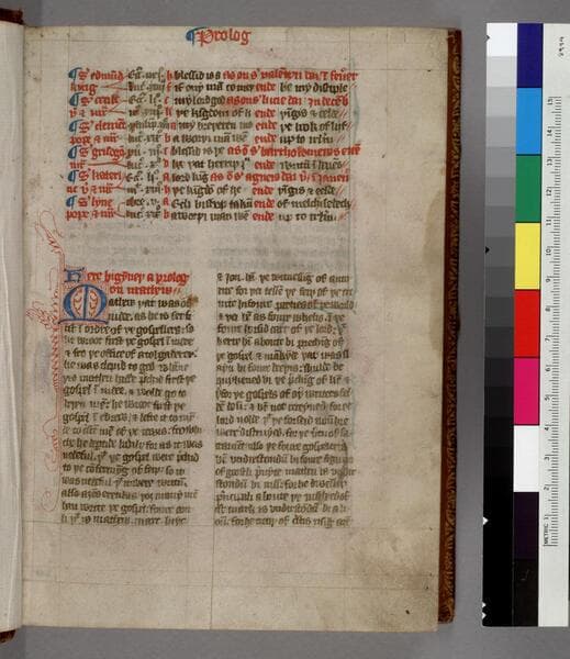 ff. 1-5v: [Pseudo William Ockham, translation of Dialogus inter militem et clericum]: Rubric: Dialogus inter militem et clericum. Incipit: Clericus y wonder sir noble knyȝt þat in fewe daies tymes beþ chaungid riȝt is yburied lawes biþ ouertorned. Explicit: Also in þe tyme of gospel hit is writen þe holy day is made for man and nouȝt man for þe holy day. Explicit dialogus inter clericum et militem. ff. 5v-20v: [Richard FitzRalph, translation of Defensio curatorum]: Rubric: Incipit sermo domini archiepiscopi Armacani. Incipit: Demeþ nought by þe face but riȝtful dome ye deme. John 8o co. Holy fadir in þe bigynnyng of my sermoun I make a protestacioun. Explicit: þerfore I conclude & pray mekelich & deuoutlich as I prayed in þe first þat I touchid: demeþ nouȝt bi þe face et cetera. Explicit. ff. 21-23v: [Pseudo Methodius, translation of Beginning of the World and the End of Worlds]: Incipit: In þe name of crist here bigynneþ þe boke of methodii þe bisshop of þe chirche of paterenis and martir of martir of [sic] crist. Explicit: And wicked men wiþout ende shul suffre peyne. Wherefore þe lord vouche he saaf to delyuer vs. qui cum patre et cetera. Explicit liber metodii episcopi. ff. 24-40v: [Alphabetical subject indexes to the Polychronicon in Latin and then in English with reference to books and chapters]. ff. 41-42: [Dialogue between a Lord and a Clerk upon Translation]: Incipit: Siþþe þat babel was ybuld men spekiþ diuerse tonges. Explicit: þan alle þat ben ywrite in þe boke of lyf shal wynde wiþ him into þe blisse of heuen and be þere in body and soule and se & knowe his godhed and manhed in Ioy wiþout eny ende. Explicit dialogus. f. 42r-v. [John Trevisa, Epistle to Sir Thomas of Barkley]: Incipit: Welþe and worshipe to my worthy and worshipful lord sir Thomas lord of Berkley. I Iohan Treuysa youre prest and youre bedman. Explicit: to se god on his blisful face in ioy wipout eny ende. Amen. Explicit epistola. ff. 43-319v: [Ranulph Higden, translation of Polychronicon]: Prologue: Incipit prefacio prima, Aftir solempne and wise writers of art and of science þat had swetnesse & likyng al her liftyme ... Prologue [f. 44v]: Prefacio secunda ad historiam, And for þis cronicle conteyneþ beringes and dedes of meny tymes ... Prologue [f. 44v]: Prefacio tercia ad historiam, To hem þat wole haue ful knowelech of stories it nedeþ eiȝte þinges to knowe ... Rubric: De orbis dimensione priscianus in Cosmagraphia [sic]. Incipit: Iulius Cesar by Counsaile of þe senatours and elder men of Rome loked and serched stories ... Explicit: þis translacion is endide in a þursday þe xviii day of Aueril þe yere of oure lorde a þousande þre hundred foure score and seuen þe tenþe yere of king Richard þe second aftir þe conqueste of englande þe yere of my lordis age sir Thomas lorde of Berkeley þat made me make þis translacion fiue and þritty. Explicit. ff. 320-325v: [115 verses on the kings of England from Alfred to Henry VI; followed by several documents concerning Richard II (his renunciation of the throne), Henry IV, Henry V, Henry VI and Edward IV (his claim to the throne of France with 2 genealogical tables]: Rubric: Hic metrice tractatur de regulis ab aluredo primo fundatore universitatis Oxoniensis circiter Annum domini D CCC lxiii usque ad henricum sextum. Incipit: Aluredus rex anglorum primusque monarcha/ Belliger invictus in scripturis bene doctus ... Explicit: Hoc tunc in fine verborum queso meorum/ Prospera quod statuat regna futura deus. Amen. [f. 325v, ruled but blank]. ff. 326-337v: [Pseudo Turpin, translation of Historia Karoli Magni; ending defectively in the 26th of 36 chapters]: Prologue: Turpine the Archebisshop of þe Bataille of Rouncivale. Here begynneth þe prologe of Turpines Story, Tvrpyne by the grace of god Archebiship of Reynes a bisye ffoluere and of grete Emperoure Charlis a ffelow with leoprande Dene of Akim gretinge and helthe euerlastinge in god ... ; [Chapter list]: B[rubricator's error for H]ere beginneth the Titulus of þe Chapitres of the Storye of the Bataille of Rouncivale of grete Charles the Emperoure, Capitulum 1m, [H]ow seynt Iame aperid to Charlis; Capitulum ii, [H]ow þe wallis of pampilione fylle down by hem selffe ... Rubric: How seint Iame apered to king Charles, Capitulum 1. Incipit: After oure lord ihesu criste had sufferid deþe and paid þe Rawnsome for synfulle man. Explicit: þen Roulonde lete him goo, and he callid to god to helpe him. And anone//. The text is preceded by a prologue and a chapter list: