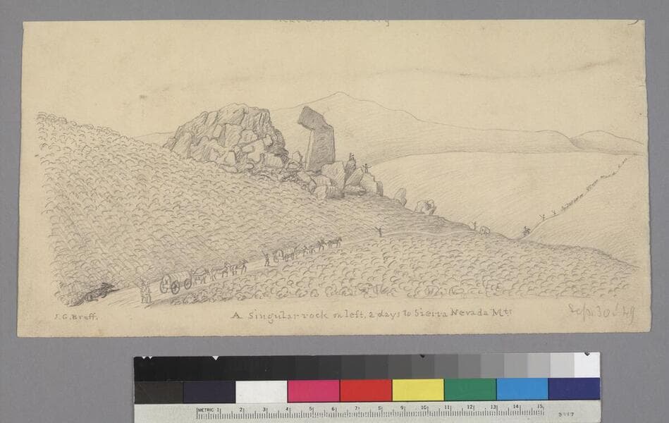The collection contains J. Goldsborough Bruff's oversize revised version of his journal (c. 1853) which documents his journey across the American plains in 1849 by way of Lassen's Trail. Also included in the collection are 264 drawings of scenes from his overland journey, of various places he visited in California, and of his sea voyage to the Eastern United States via Mexico and Panama. Many of Bruff's drawings are in pencil, but thirty-eight of them were drawn with pastels and are in color.