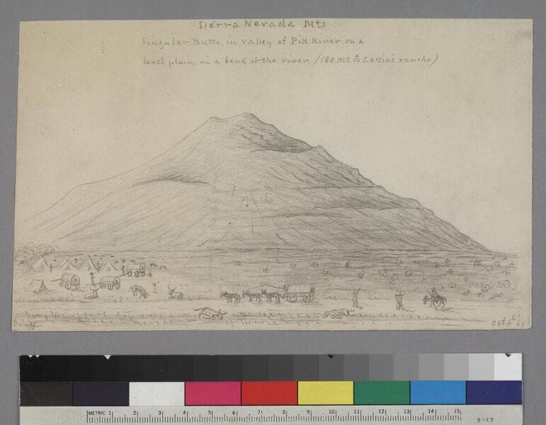 The collection contains J. Goldsborough Bruff's oversize revised version of his journal (c. 1853) which documents his journey across the American plains in 1849 by way of Lassen's Trail. Also included in the collection are 264 drawings of scenes from his overland journey, of various places he visited in California, and of his sea voyage to the Eastern United States via Mexico and Panama. Many of Bruff's drawings are in pencil, but thirty-eight of them were drawn with pastels and are in color.