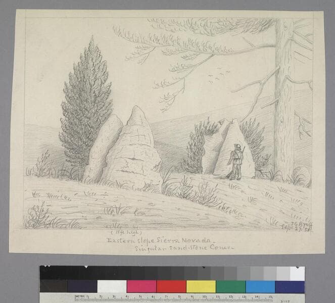 The collection contains J. Goldsborough Bruff's oversize revised version of his journal (c. 1853) which documents his journey across the American plains in 1849 by way of Lassen's Trail. Also included in the collection are 264 drawings of scenes from his overland journey, of various places he visited in California, and of his sea voyage to the Eastern United States via Mexico and Panama. Many of Bruff's drawings are in pencil, but thirty-eight of them were drawn with pastels and are in color.