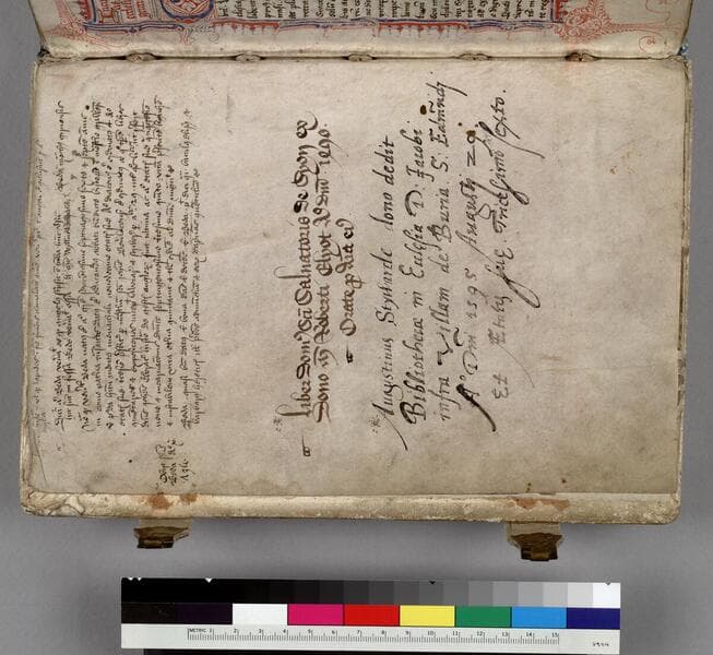 Part 1. ff. 2-113v. [Robert Holcot, Quaestiones super quattuor libros sententiarum Petri Lombardi; first leaf torn away]: Incipit: //esse contingentem et 1am teneor credere esse necessariam si dicatur quod non teneor assentire omnibus equaliter ... Explicit: Ad 11m quando queritur quid appeciit, superius dictum fuit et cetera. Explicit lectura. f. 113v: chapter list of this manuscript, with Bk. 4 preceding Bk. 3 Part 1. f. 114-117: [added in another hand]: chapter list of each questio and its articuli, and an alphabetical subject index with reference to the questiones. Part 1. f. 117v-119v: [added by same hand as chapter list]: ff. 117v-118: a quaestio about the Immaculate Conception; f. 119r-v: a note. Part 2. ff. 120-164v: [William Woodford, De causis condempnacionis articulorum 18 dampnatorum Johannis Wyclif]: Incipit: Venerabili in christo patri ac illustri domino thome cantuariensi archiepiscopo tocius anglie primati et sedis apostolice legato humilis suus servitor frater Willelmus Wydford devotissimum humilitatis et subiectionis famulatum. Reverendissime pater, mandatis vestris obtemperando causas condempnacionis articulorum per vos nuper dampnatorum ... Explicit: si in hiis dictis alicubi recessi a via veritatis et parcere michi velet vestra dominacio quamvis hoc opus non habeat in singulis articulis discussionem plenam quia pro completa discussione tot articulorum tempus quadragesimale per vestram reverenciam taxatum fuit nimis breve. Scripta in castro de framlynham in vigilia pasche per auctoritatem vestram venerabilem atque dominacionem ad catholice fidei defensionem conservet Ihesus christus feliciter per tempora longiora. Amen. Witford minor. Part 2. ff. 164v-165v: [Augustine, Excerpts from his Letter to Casulanus] Rubric: Augustinus de ieiunio sabbati ad casulanum. Incipit: Si nullo modo liceret sabbato ieiunare 40 continuos dies. Explicit: sine ullo scrupulo vel disceptacione facite. Explicit augustinus de ieiunio sabbati ad Casulanum. Amen. [f. 165v blank]. Part 2: ff. 166-168: [Franciscus de Mayronis, Sermon]: Rubric: Memoriam fecit mirabilium suorum et cetera. Incipit: Tria sunt preconia quibus mundani principes solent principaliter commendari ... Explicit: in corpore organico et christi corpus in hoc sacramento. Explicit sermo de corpore christi quem composuit frater franciscus de maronis doctor sacre theologie. Ihesus amen. Part 2. ff. 168v-174: [Franciscus de Mayronis, Sermon]: Rubric: Quodcumque ligaveris super terram et cetera. Incipit: Mt. 16, Duos fines ultimos futuros esse in fine seculi describit augustinus 13 libro de civitate dei quorum unus est dampnatorum pena eterna. Explicit: qui solem suum facit oriri super bonos et malos et pluit super iustos et iniustos cui est honor et gloria in secula seculorum amen. Explicit sermo fratris francisci de maronis de potestate clavium. Part 2. ff. 174v-182v: Rubric: Utrum per scripturam veteris testamenti poterit probari. Incipit: quod christus in lege promissus iam venit. Arguitur primo quod non quia cum iudei acceptent. Explicit: Tenendum est igitur firma fide christum in carnem venisse propter dicta patriarcharum. Non plus hic de adventu messie. Ihesus amen. f. 182: 12-line note in a contemporary running hand. ff. 180v-182v, blank.