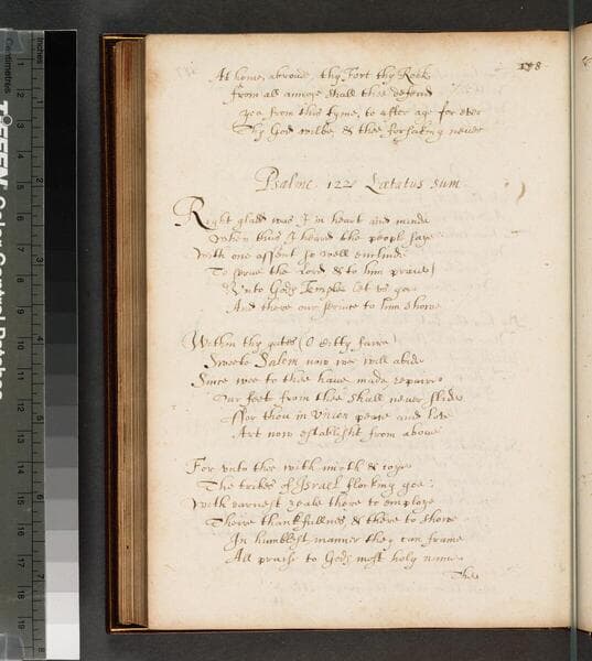 ff. 1-164; f. 164v blank. [Psalms]. Incipit: Hee Blessed is that neither loosely treades/ The straying steps as wicked councell leades. Explicit: Conclude by all that ayre or life enfold/ Let high Jehovah highly be extolde. Finis. The Seaven Penitentiall Psalmes of David. Psal. 6o, 32o, 51o, 102o, 130o, 143o. Rubric: The Psalmes of David done into English Verse by the Most Noble & Vertuous gent. Sr Phillipp Sidney Knt. Psalm 1. English. Other creator(s): Philip Sidney, translator; Mary Sidney Herbert, translator. J. C. A. Rathmell, ed., The Psalms of Sir Philip Sidney and the Countess of Pembroke (New York 1963) for the complete text of the 150 psalms, printed from the Penshurst manuscript belonging to the Viscount De L'Isle. W. A. Ringler, Jr., ed. The Poems of Sir Philip Sidney (Oxford 1962) 270-337, for the first 43 psalms, those translated by Sir Philip Sidney, omitting the Countess of Pembroke's revisions and additions. This manuscript collated by Ringler as L.