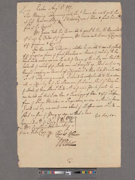 A collection of correspondence, documents, and maps related to the Walking Purchase and the Councils of Easton retained by the office of Pennsylvania's governor William Denny (in office from August 1756 to October 1759). The bulk of the collection consists of the records of the Council of Easton (August 1757) and the inquiry into the legality of the Walking Purchase authorized by Denny. It contains affidavits, sworn testimony, exhibits, memorandum, correspondence, and notes; this material includes original documents dating back to the time of the fraudulent land deal as well as some military correspondence. The collection also includes several documents and letters concerning Native American troubles on the frontier in the 1740s, along with their protests to the Proprietors over rum being sold to their people. Important persons in the collection include, among others, William Allen, Benjamin Chew, George Croghan, William Denny, Benjamin Franklin, James Hamilton, William Markham, Israel Pemberton, Thomas Penn, Richard Peters, Nicholas Scull, Teedyuscung (Delaware Chief), George Thomas, and Conrad Weiser. Almost all of the material in the collection is docketed and bears the initials or signatures of W. H. Rolph, followed by hyphenated numbers. The collection also contains oversize material and a small group of 20th century newspaper clippings about the Walking Purchase and the material in this collection.
