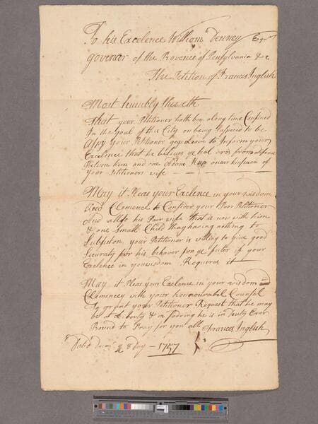 A collection of correspondence, documents, and maps related to the Walking Purchase and the Councils of Easton retained by the office of Pennsylvania's governor William Denny (in office from August 1756 to October 1759). The bulk of the collection consists of the records of the Council of Easton (August 1757) and the inquiry into the legality of the Walking Purchase authorized by Denny. It contains affidavits, sworn testimony, exhibits, memorandum, correspondence, and notes; this material includes original documents dating back to the time of the fraudulent land deal as well as some military correspondence. The collection also includes several documents and letters concerning Native American troubles on the frontier in the 1740s, along with their protests to the Proprietors over rum being sold to their people. Important persons in the collection include, among others, William Allen, Benjamin Chew, George Croghan, William Denny, Benjamin Franklin, James Hamilton, William Markham, Israel Pemberton, Thomas Penn, Richard Peters, Nicholas Scull, Teedyuscung (Delaware Chief), George Thomas, and Conrad Weiser. Almost all of the material in the collection is docketed and bears the initials or signatures of W. H. Rolph, followed by hyphenated numbers. The collection also contains oversize material and a small group of 20th century newspaper clippings about the Walking Purchase and the material in this collection.
