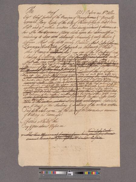 A collection of correspondence, documents, and maps related to the Walking Purchase and the Councils of Easton retained by the office of Pennsylvania's governor William Denny (in office from August 1756 to October 1759). The bulk of the collection consists of the records of the Council of Easton (August 1757) and the inquiry into the legality of the Walking Purchase authorized by Denny. It contains affidavits, sworn testimony, exhibits, memorandum, correspondence, and notes; this material includes original documents dating back to the time of the fraudulent land deal as well as some military correspondence. The collection also includes several documents and letters concerning Native American troubles on the frontier in the 1740s, along with their protests to the Proprietors over rum being sold to their people. Important persons in the collection include, among others, William Allen, Benjamin Chew, George Croghan, William Denny, Benjamin Franklin, James Hamilton, William Markham, Israel Pemberton, Thomas Penn, Richard Peters, Nicholas Scull, Teedyuscung (Delaware Chief), George Thomas, and Conrad Weiser. Almost all of the material in the collection is docketed and bears the initials or signatures of W. H. Rolph, followed by hyphenated numbers. The collection also contains oversize material and a small group of 20th century newspaper clippings about the Walking Purchase and the material in this collection.
