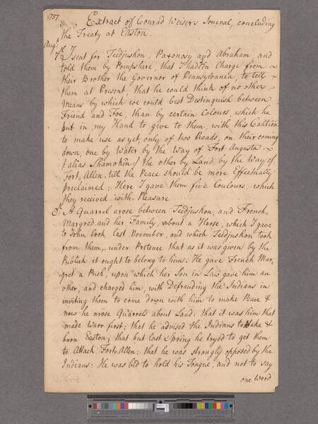 Conrad Weiser response to Charles Thomson's Enquiry into the Causes of the Alienation of the Delaware and Shawnees Indians