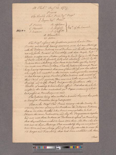 William Allen, James Hamilton, Richard Peters, and Nicholas Scull deposition relating to the 1686 Walking Purchase deed and the 1737 Council