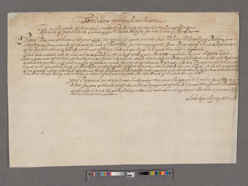 Bushell, Edward & others. To the King's Most Excellent Majesty [Charles II]: Petition of the Commanders and Owners of ships that transported Sir Tobias Bridge's Regiment to Barbados