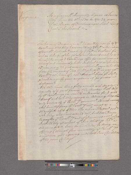 Virginia. General Assembly. House of Burgesses. To Thomas Lord Culpeper : [Offer of a gift 500ℓ] James Citty, [Virginia]