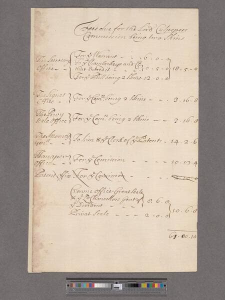 Great Britain. Treasury. Fees due for the Lord Culpeper's Commission being two Skins