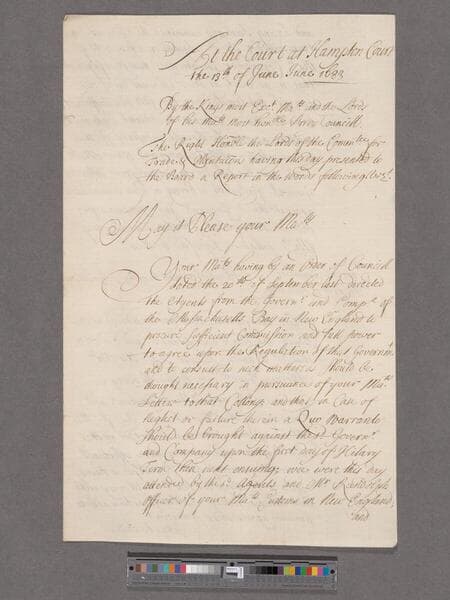 Great Britain. Privy Council. Order and Report for a Quo Warranto against the Bostoners Charter. Hampton Court