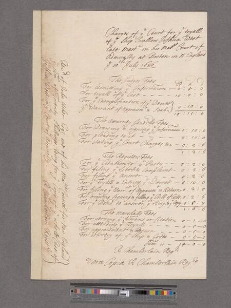 Massachusetts. Court of Admiralty. Charges of ye Court for ye tryall of ye Ship Swallow ... in his Matys Court of Admiralty