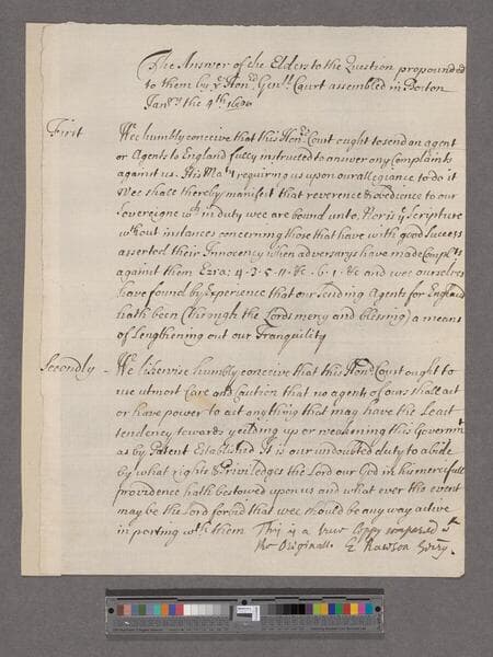 Congregational Churches of Massachusetts. Elders . The Answer of the Elders to the Question propounded to them by ye Hond. Genll. Court