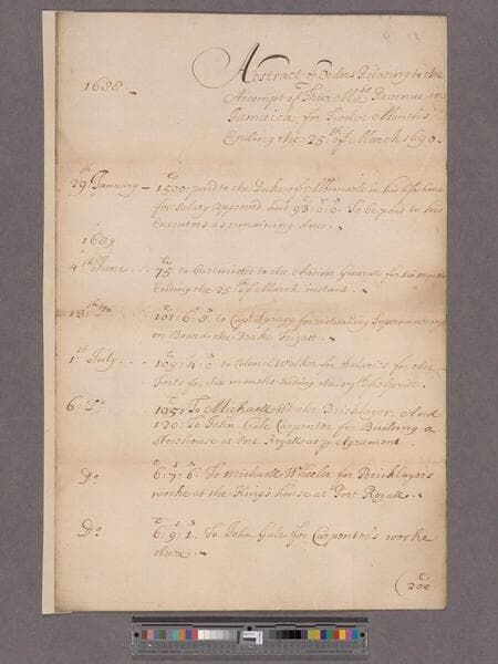 Ryves Thomas?. Abstract of orders relating to the Account of Revenue in Jamaica for twelve months ending 25th Mar. 1690