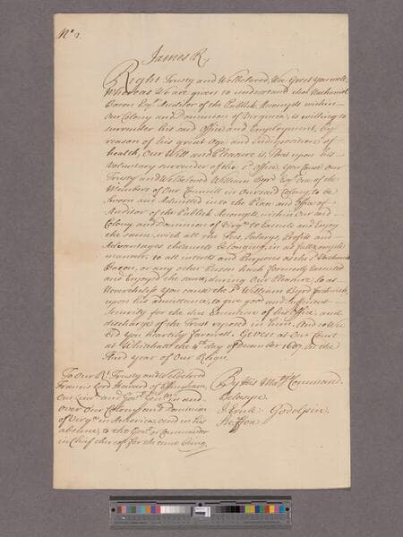 James II, King of Great Britain. To Francis, Lord Howard of Effingham : [Warrant for the appointment of William Byrd I, as auditor of Virginia.] Whitehall