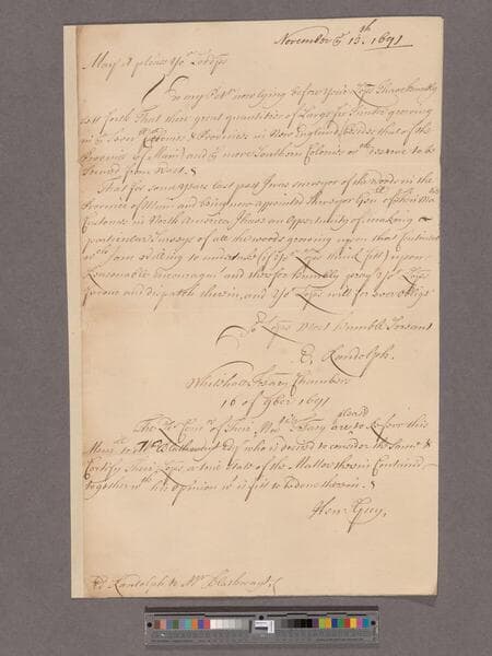 Randolph, Edward. To the Lords of His Majesty's Treasury : Petition to be surveyor of the Woods in the north part of America