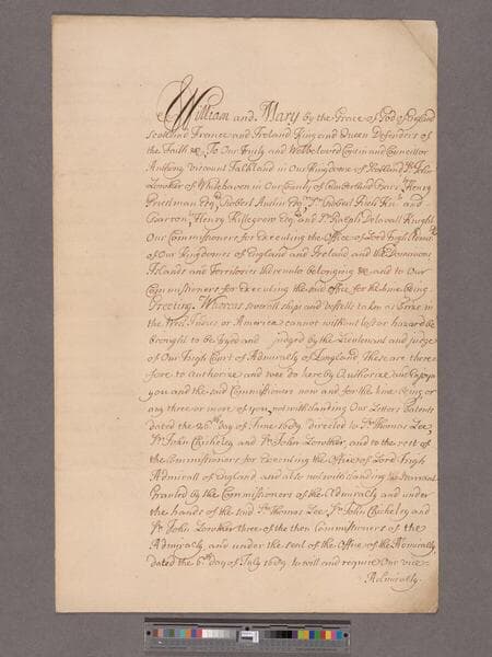 William III & Mary II, King & Queen of Great Britain. To Our Commissioners for Executing the Office of Lord High Admiral : Warrant for trying Prizes in the West Indies & America