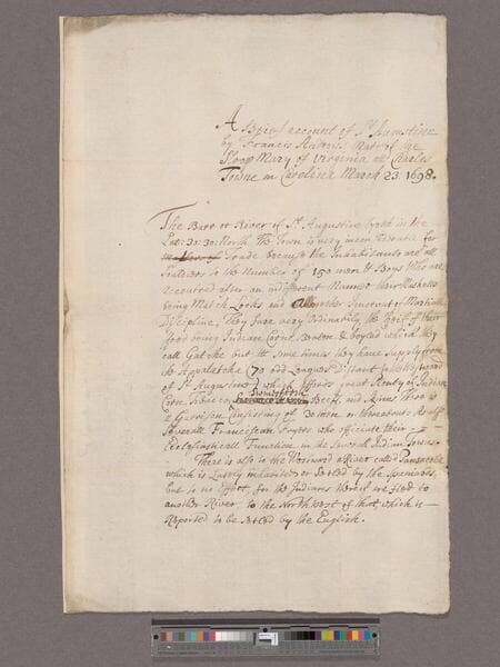 Andrews, Francis. [To Edward Randolph] : A Brief account of St. Augustine by [the] Mate of the Sloop Mary of Virginia att Charles Towne in Carolina