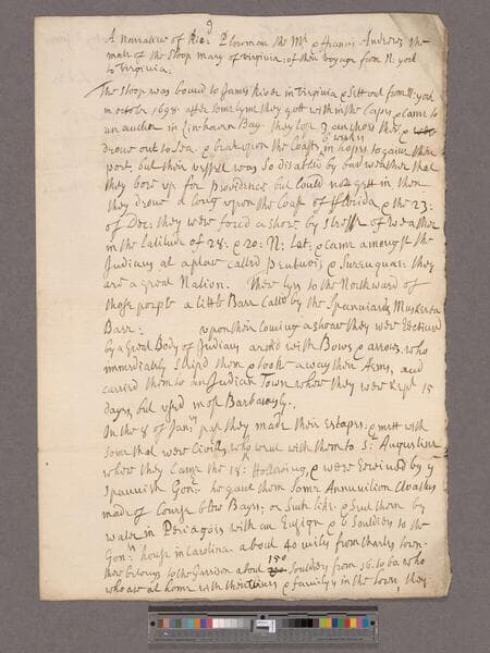 ![Andrews, Francis. [To Edward Randolph] : A Brief account of St. Augustine by [the] Mate of the Sloop Mary of Virginia att Charles Towne in Carolina](/_next/image?url=https%3A%2F%2Frail.huntington.org%2FIIIF3%2FImage%2F22APN4M46RHX%2Ffull%2F%5E360%2C%2F0%2Fdefault.jpg&w=750&q=75)