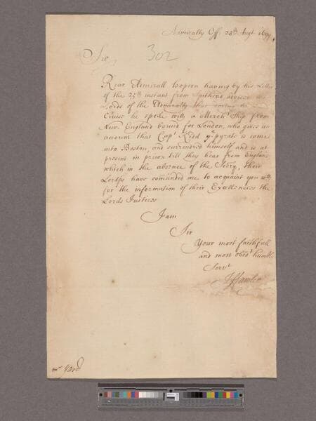 Great Britain. Admiralty. To Robert Yard, Secretary to the Lords Justices
