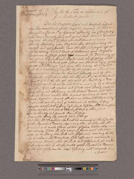 New Hampshire. General Assembly. An act for a Tax or Assessment of 500 pounds to be given until Richard, Earle of Bellomont in testimony of "our great regard."