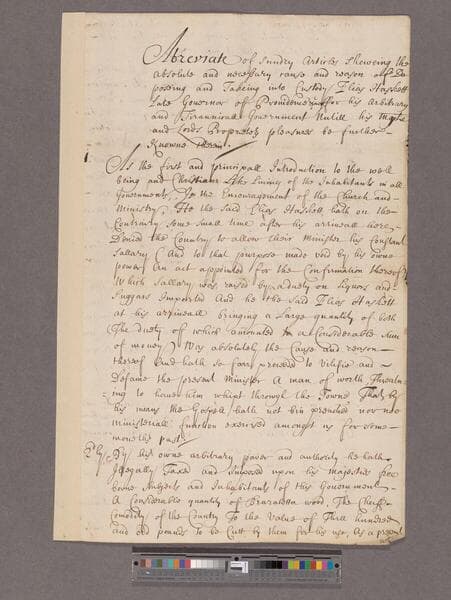 Lightwood, Ellis. A breviate of sundry Articles shewing the absolute and necessary cause and reason of Deposing Elias Haskett, Late Governor of Providence