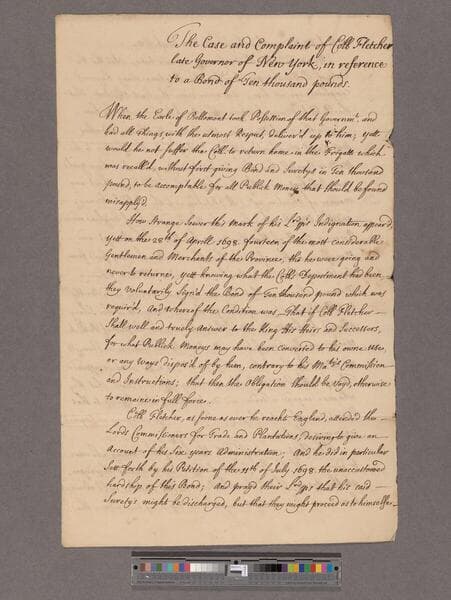 Fletcher, Benjamin. The Case & Complaint of Coll. Fletcher ... in reference to a Bond of Ten Thousand pounds