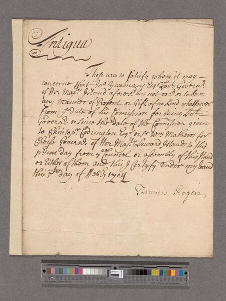 Rogers, Francis. [Certificate to the effect that John Yeomans, Lieut. Governor of Antigua has received no salary from the Council or Assembly of the Island]