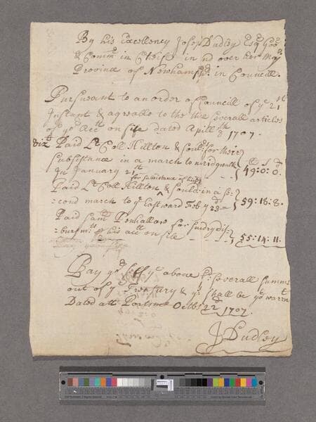 Dudley, Joseph. To Samuel Penhallow : Pay warrant. Portsmouth, [New Hampshire]