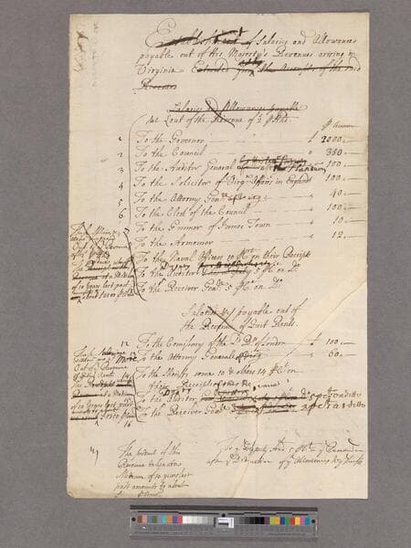 Blathwayt, William. Salaries and Allowances payable out of his Majesty's Revenues arising in Virginia