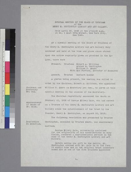 Henry E. Huntington Library and Art Gallery Board of Trustees minutes of special meeting