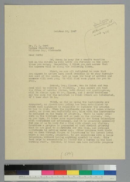 EPH writes to astronomer Jan Oort of the Yerkes Observatory