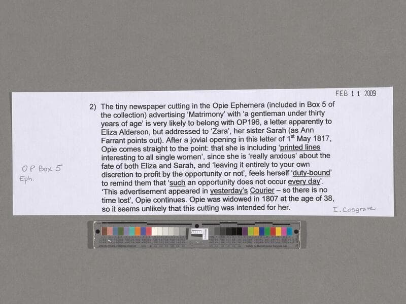 Amelia Opie to Eliza Briggs 1834 January 25-1839 and ephemera