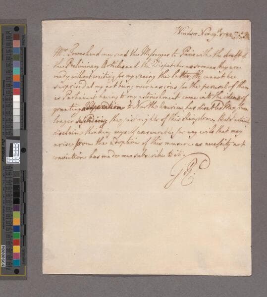 Letters and documents relating to British and American relations. Includes autograph letters to Townshend from William Pitt, the 1st Earl of Chatham, from 1774 to 1776, and George III, from 1782 to 1784; Henry McCulloh's "Several thoughts. on the Stamp duty," 1765, and Silas Deane's "Observations and proposals relating to a Navigable Canal from Lake Champlain to the St. Lawrence," from 1785 to 1787. "A Provisional Act for Settling Troubles in America," 1776 and "Memorandum of a Declaration to Dr. Addington relating to American colonies," 1776, by William Pitt, 1st Earl of Chatham; the minutes of a cabinet formed in 1782 for the purpose of negotiating peace with the United States and letters from George III to Townshend, 1782 to 1783, are bound in two volumes. The volumes also contain the original portrait of William Pitt, 1st Earl of Chatham, by William Hoare, and Thomas Townshend's copies of "An Act to Enable His Majesty to conclude a Peace with the United States of America" (London : Printed at Charles Eyere and William Straham, 1782) and "Provisional articles signed at Paris, the 30th of November, 1782 by the Commissioner of His Britannic Majesty, and the Commissioners of the United States of America” (London : Printed by T. Harrison and S. Brooke, in Warwick-Lane, 1783).