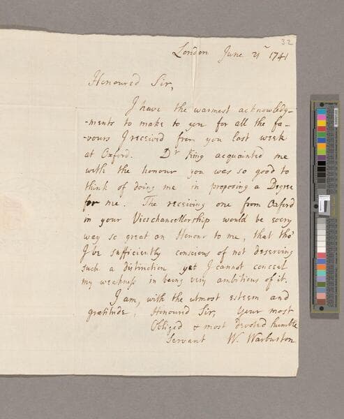 Theophilus Leigh letter, Balliol College, to William Warburton