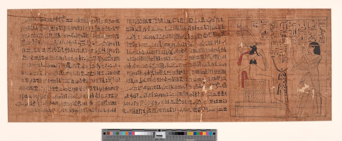 Eighteen-sheet papyrus containing the text of the Adoration of Osiris and spells from the Book of the Dead. Written for the woman Taatemperamun, who also had the title "head of household" and "singer of Amun-Re, king of the gods". Originated in Thebes during the Third Intermediate Period, Dynasty 21, (approximately 990-976 B.C.)