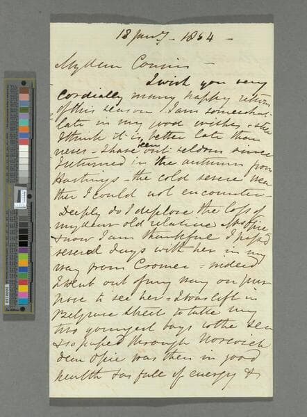 A collection of manuscripts and correspondence by Amelia Alderson Opie; with related family material which includes manuscripts, correspondence, and ephemera. The Opie material includes two corrected manuscript travel journals, poems, and songs; the correspondence includes letters to various family members. There is also a poem, "To Mrs. Opie," by Sir Edward Denny (1796-1889), the hymnist, and one letter to Opie by James Smith (1775-1839), the writer and humorist. The manuscripts and letters are written by Opie unless otherwise noted. The family-related manuscript material includes fair copies of poems, prose pieces, and excerpts from Jane Austen. The correspondence includes letters from, among others, Elizabeth Alderson Briggs, Henry Perronet Briggs, Hilda Mary Carr, and James Haslewood Carr; many of the letters are addressed to Catharina M. Briggs. Some of these letters date from when Amelia Opie was alive, and a few make brief mention of her, but many of these letters date from after her death. The collection also contains the will of Samuel Dickens (1774) and one folder of ephemera.