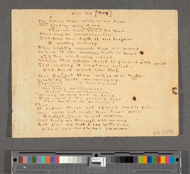 This box includes "Anne Askew, Imitation," written in French; "The Lord's Prayer;" "My darling, thou wilt never know," written on the death of her sister Emily; and "There's little joy in life for me," written on the death of her sister Anne. The letters include one letter to Mrs. Elizabeth Gaskell, and a group of letters to William Smith Williams.