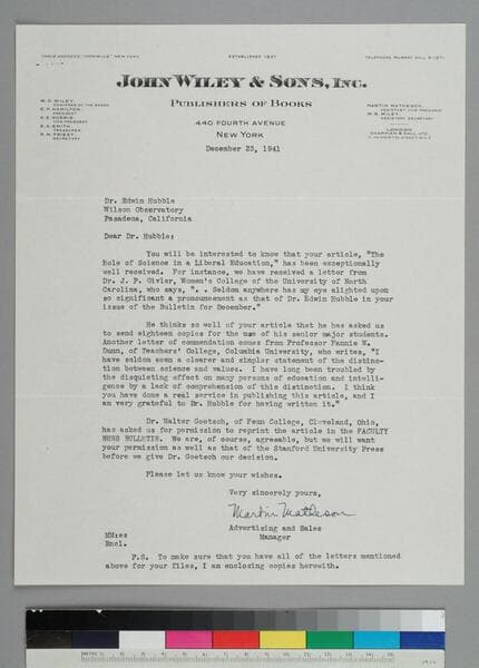Martin Matheson, Advertising and Sales Manager, John Wiley & Sons, Inc., writes to EPH