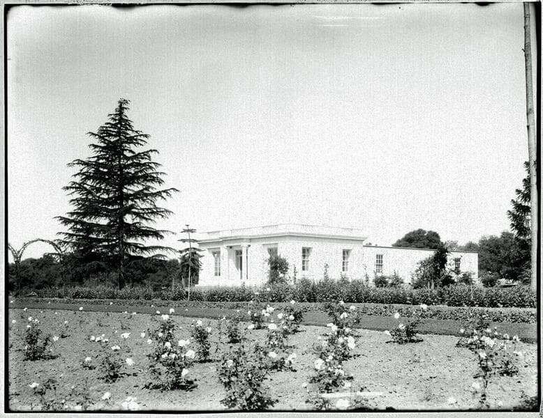 An early view of the rose garden, with an arbor on the left, and the bowling alley (now the Tea Room) in the distance on the right.
