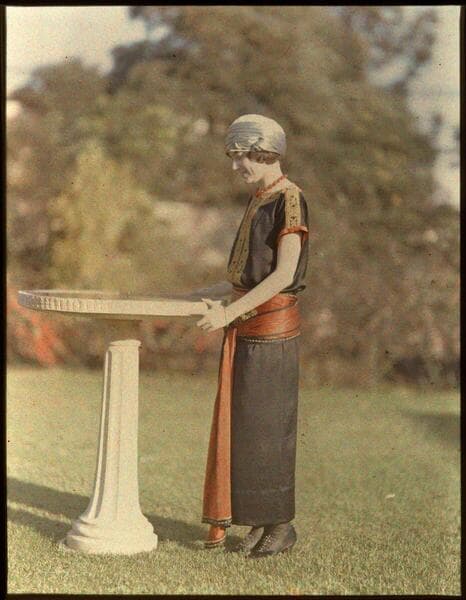 Autochrome half length portrait of Anna Hyatt Huntington. She is wearing a black dress with wide gold trim down the front and across the shoulders and red trim at the sleeves and on the skirt. She wears a necklace of red beads and has her hair styled in finger curls. Mrs. Huntington was the second wife of Archer Huntington, Arabella Yarrington Huntington's son (born prior to her marriage to Collis Huntington). MS note on verso of plate mounting reads "Anna Hyatt Huntington."